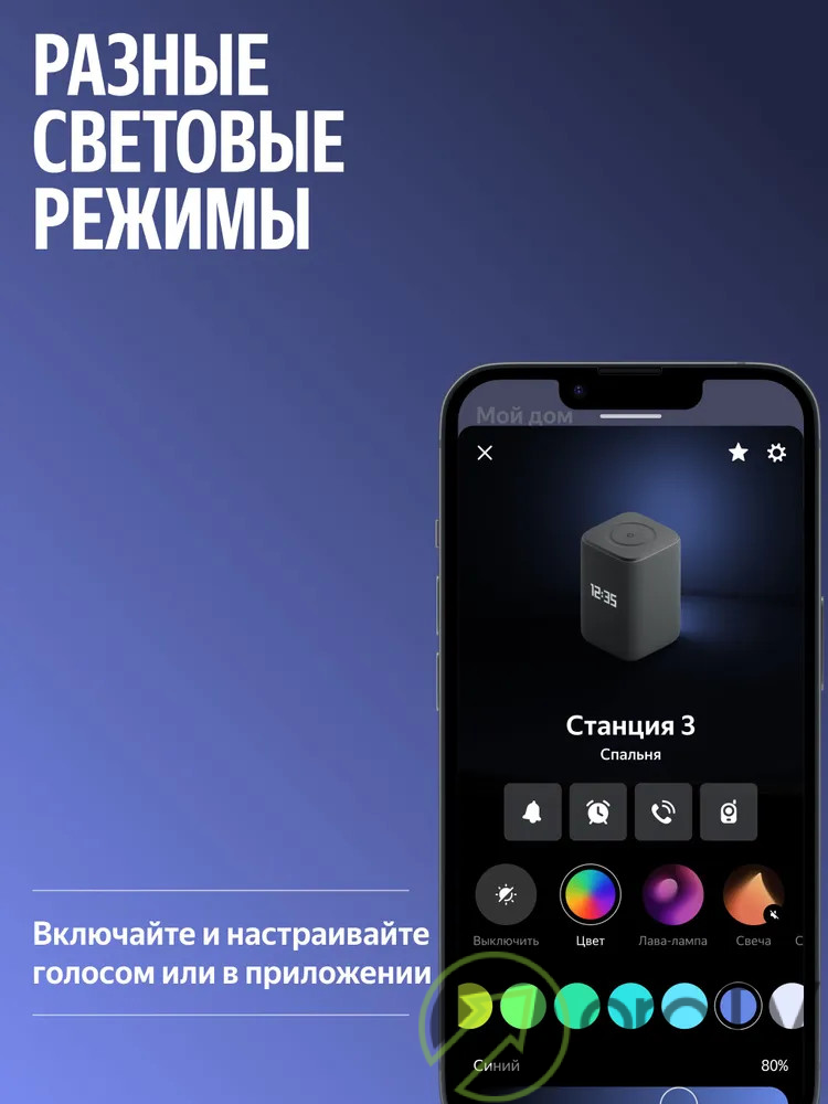 На задней панели умной колонки находится эмбиент-подсветка, которая поддерживает 16 миллионов цветов. Выбирайте готовые световые режимы для разных поводов или настраивайте свои сценарии. Станция 3 подстроится под ваше настроение, создавая нужную атмосферу.